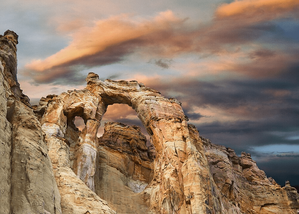In the heart of Grand Staircase–Escalante National Monument, Grosvenor Arch rises out of pale desert sandstone like a golden cathedral. Twin openings curve together in perfect symmetry, their surfaces polished by centuries of rain and wind. A short paved trail leads right to its base, where the colors shift through cream, amber, and soft orange as the sun moves across the sky.