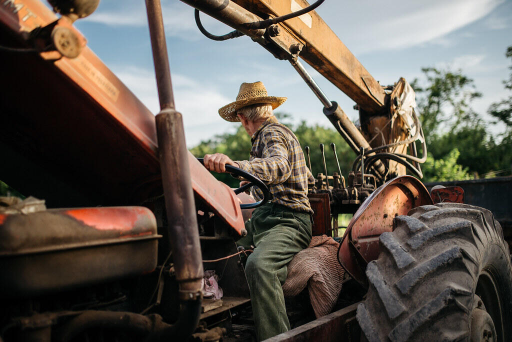 Elderly man sitting on a couch outdoors